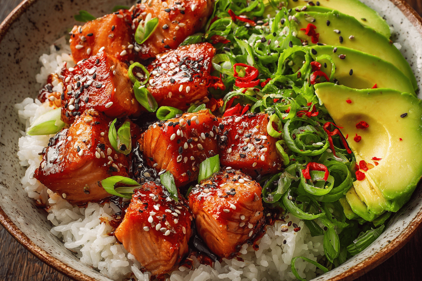 A crispy, savory rice bowl topped with flaked salmon, spicy mayo, and fresh toppings. Packed with texture and flavor — perfect for weeknights or lunch meal prep.