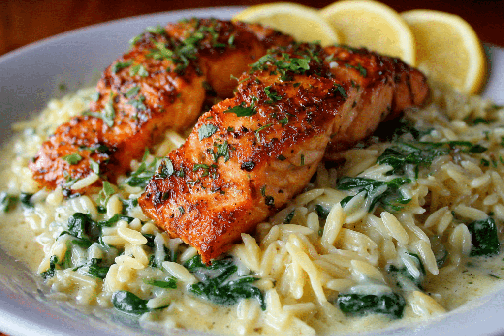 Seared Salmon with Lemon Orzo is a simple, elegant meal that delivers restaurant-quality flavor with minimal effort. Crispy, golden salmon fillets sit atop a bed of creamy lemon orzo, studded …