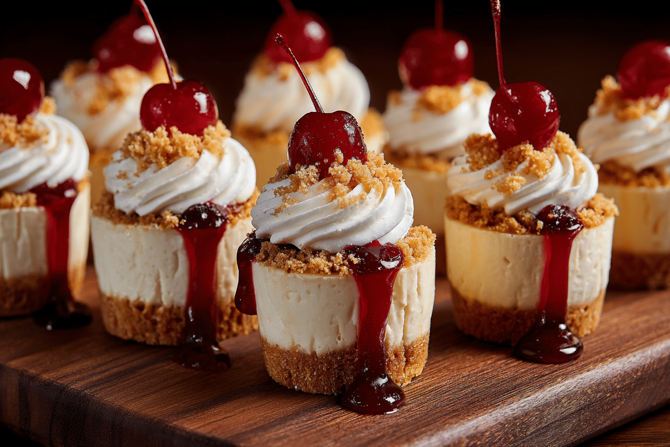 Mini cheesecakes with a graham cracker crust, creamy vanilla filling, and a sweet cherry topping — perfect for parties or make-ahead desserts.