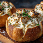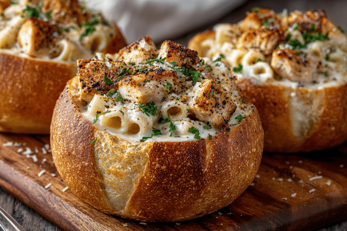 Chicken Alfredo Garlic Bread Bowls combine creamy Alfredo-coated chicken with crispy, golden garlic bread bowls, topped with bubbling cheese for the ultimate comfort food.