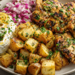 Chicken with Lemon Feta Dip & Crispy Potatoes is a bright, savory, and deeply satisfying dish that brings together Mediterranean flavors with a comforting, crispy edge. Tender, herb-seasoned chicken is seared or roasted to perfection, served alongside golden roasted potatoes, and paired with a tangy, creamy lemon feta dip that ties everything together beautifully.