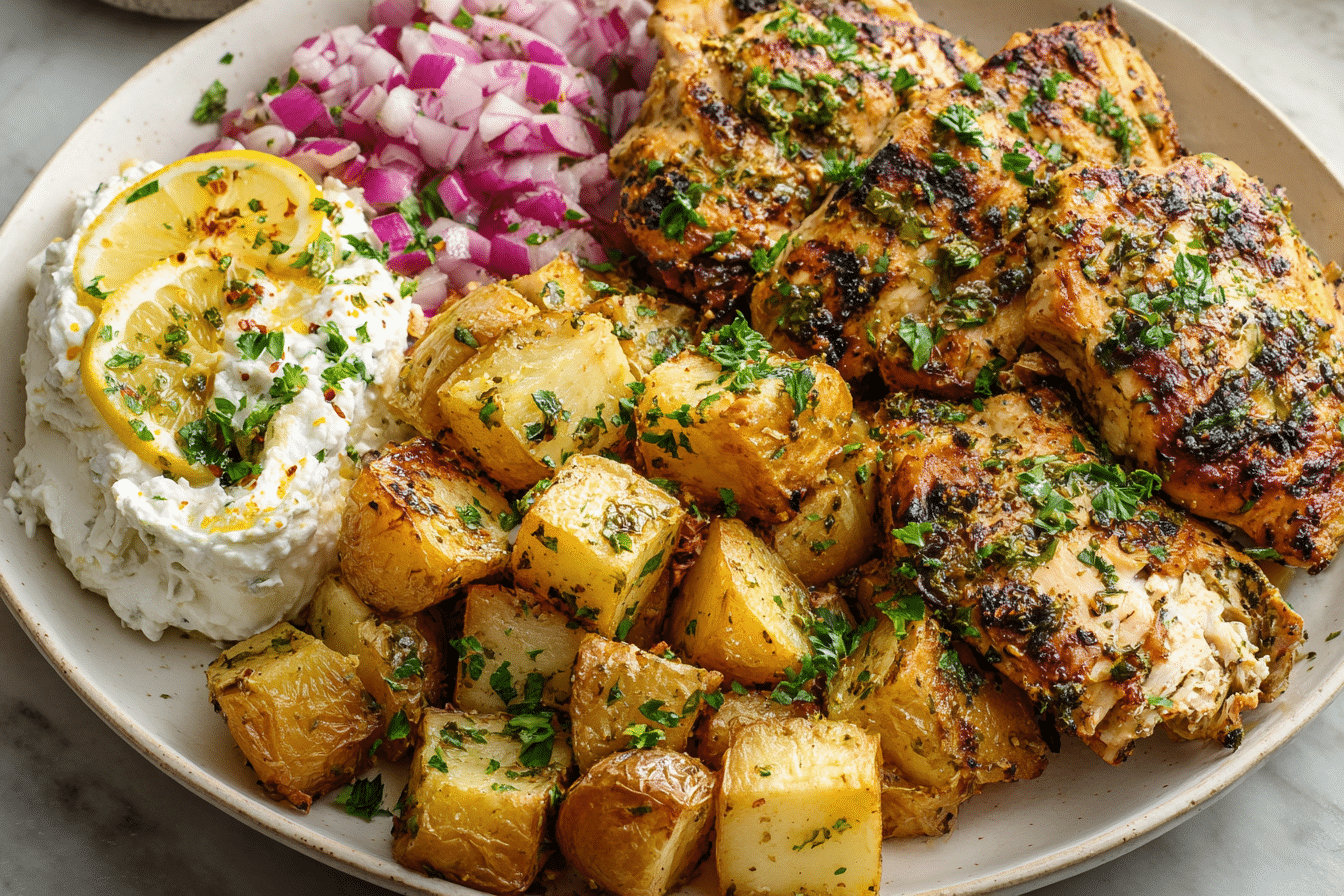 Tender lemon-herb chicken served with golden crispy potatoes and a zesty lemon feta dip — a Mediterranean-inspired meal perfect for weeknights or entertaining.