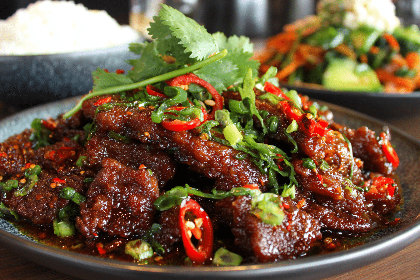 Crispy strips of beef tossed in a sticky, spicy chilli sauce — a homemade takeout favorite that’s crunchy, sweet, and fiery in all the right ways.