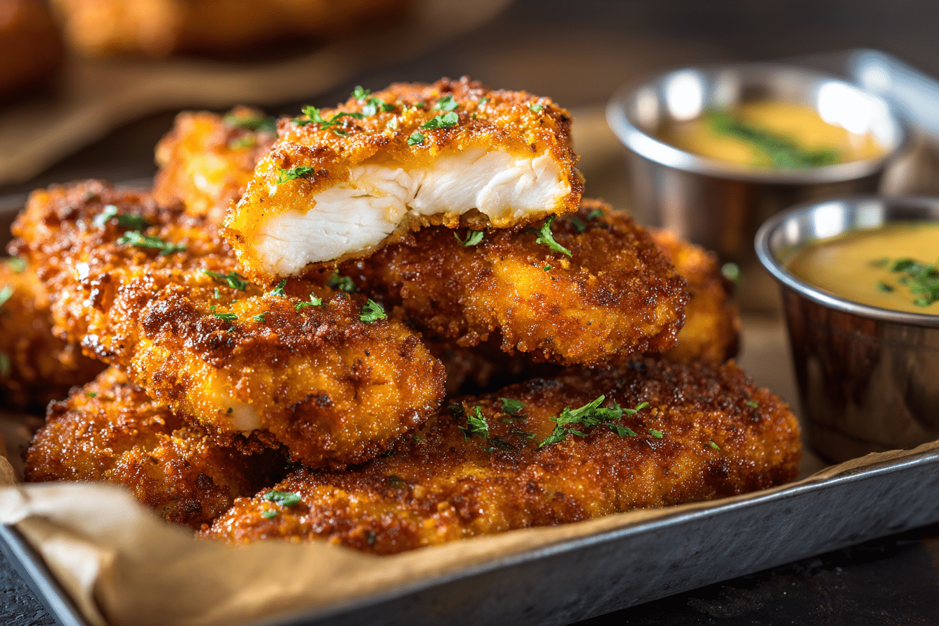 Bake for 18–22 minutes, flipping halfway through for even browning. The tenders are done when the coating is deep golden and the internal temperature reaches 165°F (74°C).