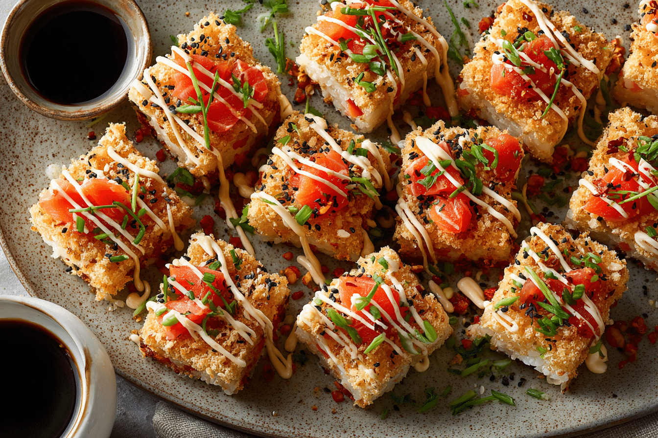 This dish balances protein-rich salmon with fiber-packed rice and healthy fats from avocado and sesame. Baked instead of fried, it’s lighter than tempura sushi and can be adapted for many diets.