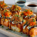 Inspired by the viral sushi bake trend, this recipe layers seasoned sushi rice, spicy salmon mix, and melty toppings into one bubbling, golden tray. It’s a cozy, family-style version of sushi that doesn’t require rolling or raw fish, making it a weeknight-friendly, beginner-approved favorite.