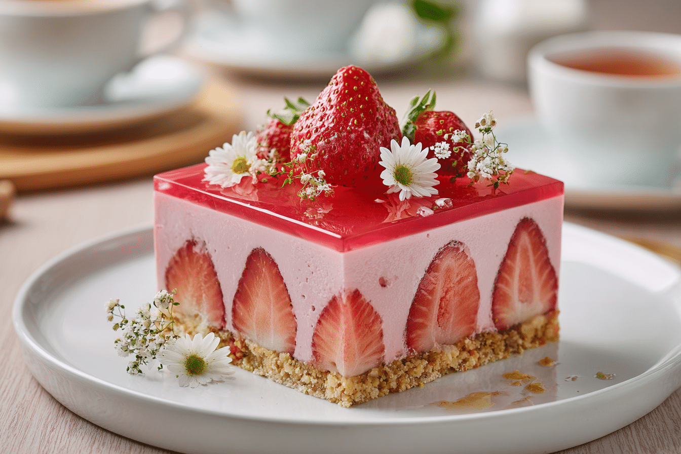 A stunning layered dessert featuring sponge cake, fresh strawberries, and a glossy strawberry jelly top — light, fruity, and perfect for elegant gatherings.