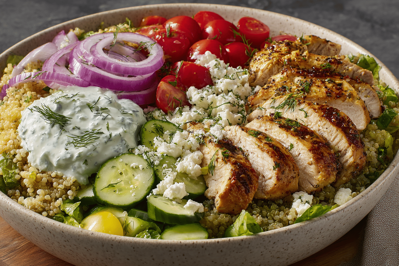 Flavorful Greek chicken served over a bed of rice or grains, topped with crisp veggies, olives, feta, and a creamy homemade tzatziki sauce. Perfect for meal prep or easy dinners.