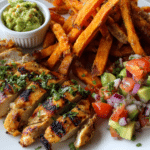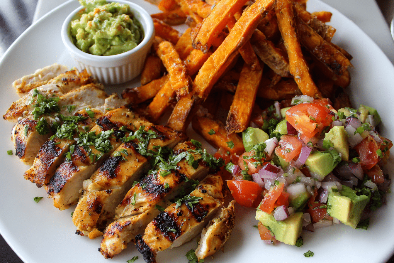 PrintGrilled Herb Chicken Bowl with Sweet Potato Fries & Avocado Salsa – A Fresh & Flavorful Power Meal