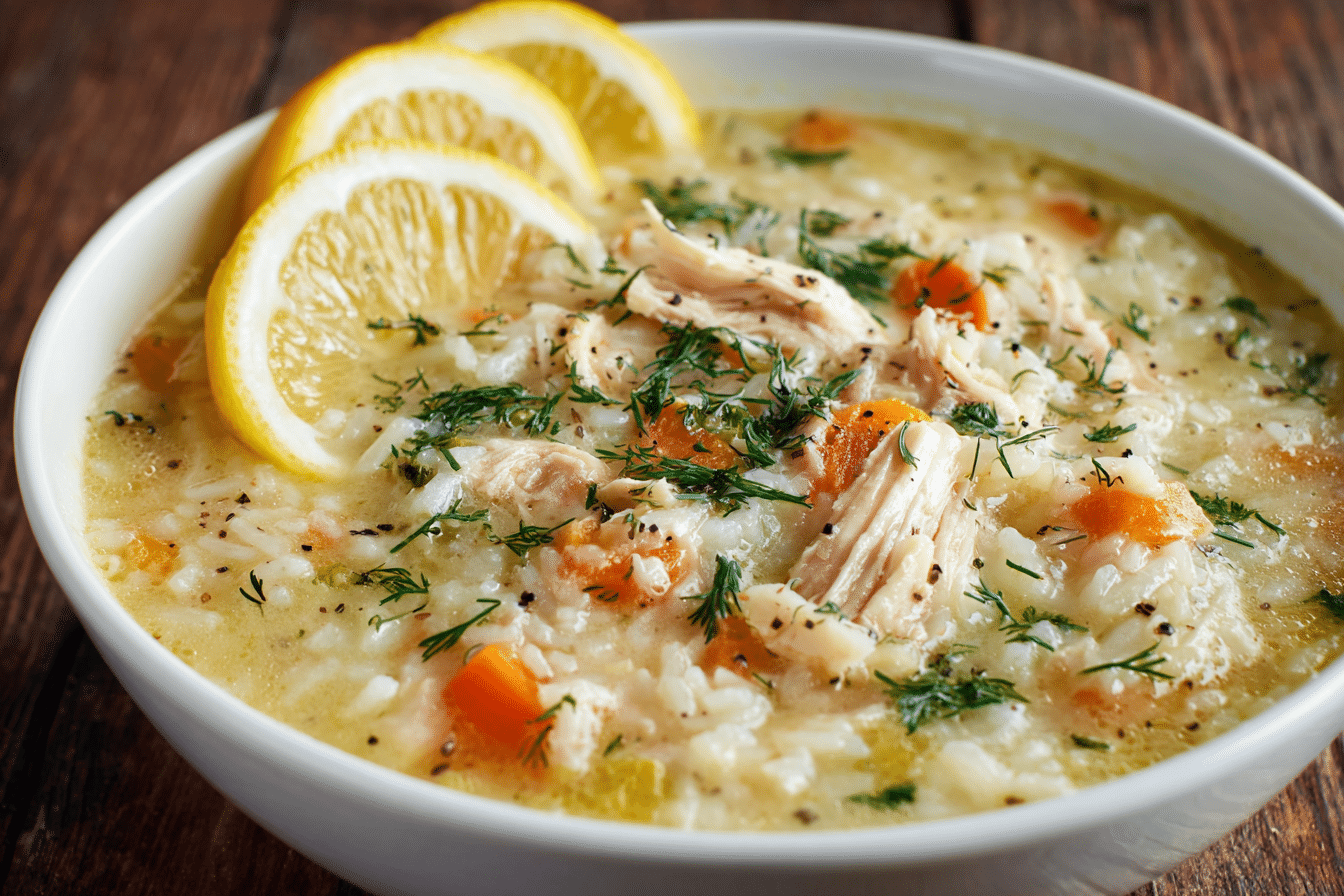This healthy Greek lemon chicken soup (Avgolemono) is creamy, comforting, and dairy-free — made with chicken, rice, eggs, and lemon. A cozy and protein-rich Mediterranean meal.