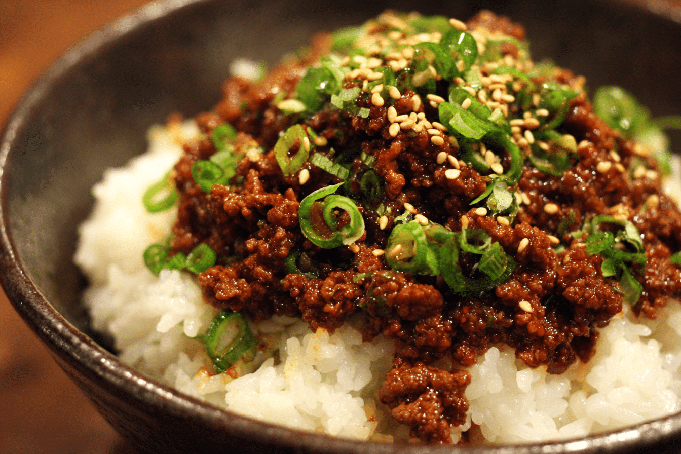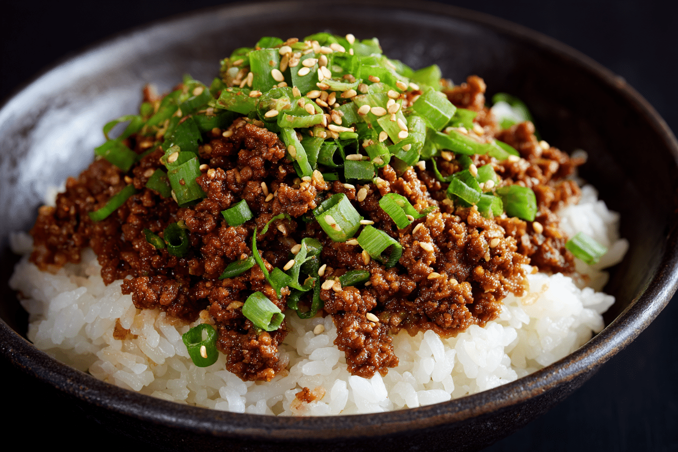 Spoon the beef mixture over freshly cooked rice. Top with green onions, sesame seeds, or a fried egg for extra richness.