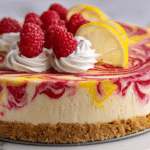 A creamy lemon cheesecake swirled with fresh raspberry purée on a buttery graham cracker crust. Tangy, fruity, and perfect for spring or summer desserts.