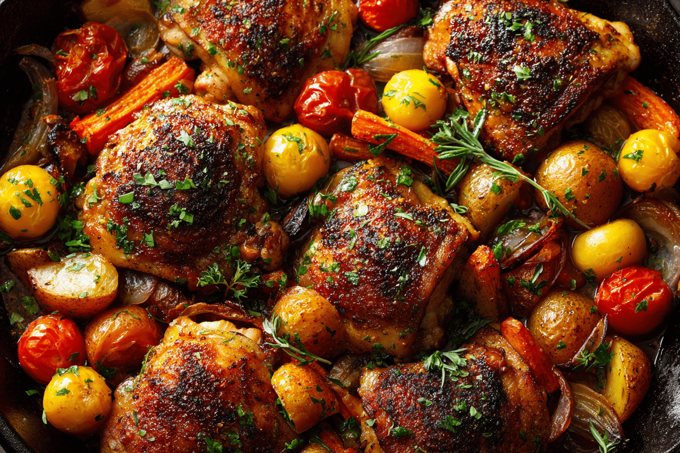 Juicy chicken cooked in one pan with tomatoes, olives, garlic, and herbs for a Mediterranean-style dinner.