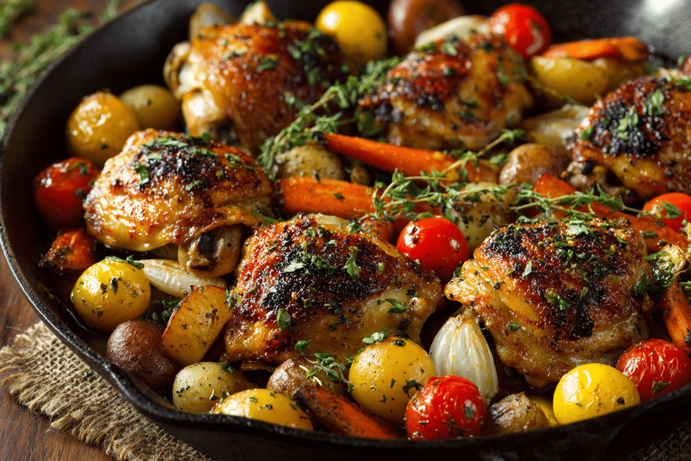 Chicken thighs are ideal for One-Pan Mediterranean Chicken because they remain juicy and flavorful during skillet cooking. Boneless or bone-in thighs both work, though boneless cook slightly faster. Chicken breasts can be used as well, but they require closer attention to prevent drying.