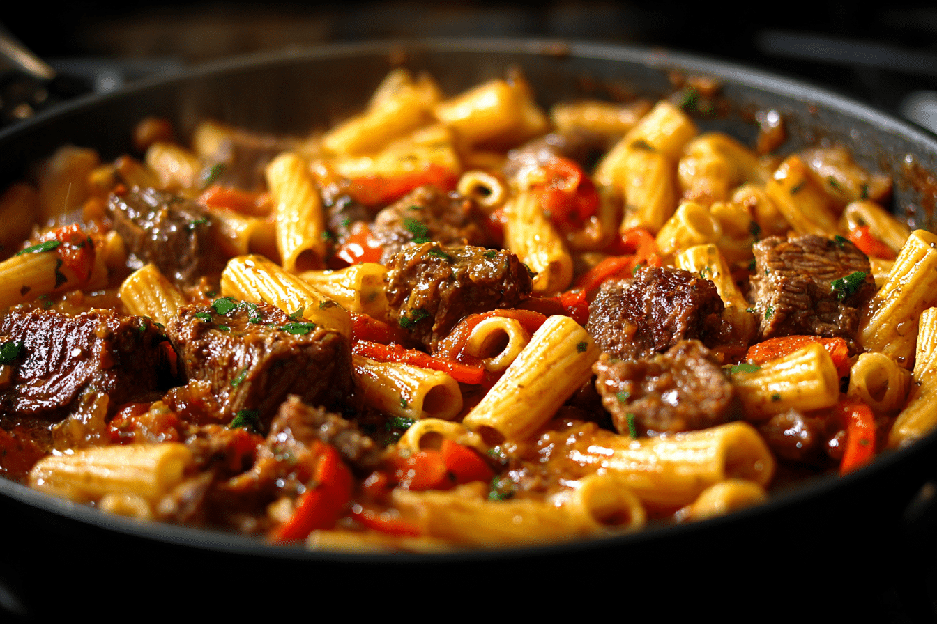 Tender steak strips and al dente pasta tossed in a spicy garlic butter Parmesan sauce — all made in one skillet for a quick, indulgent dinner.