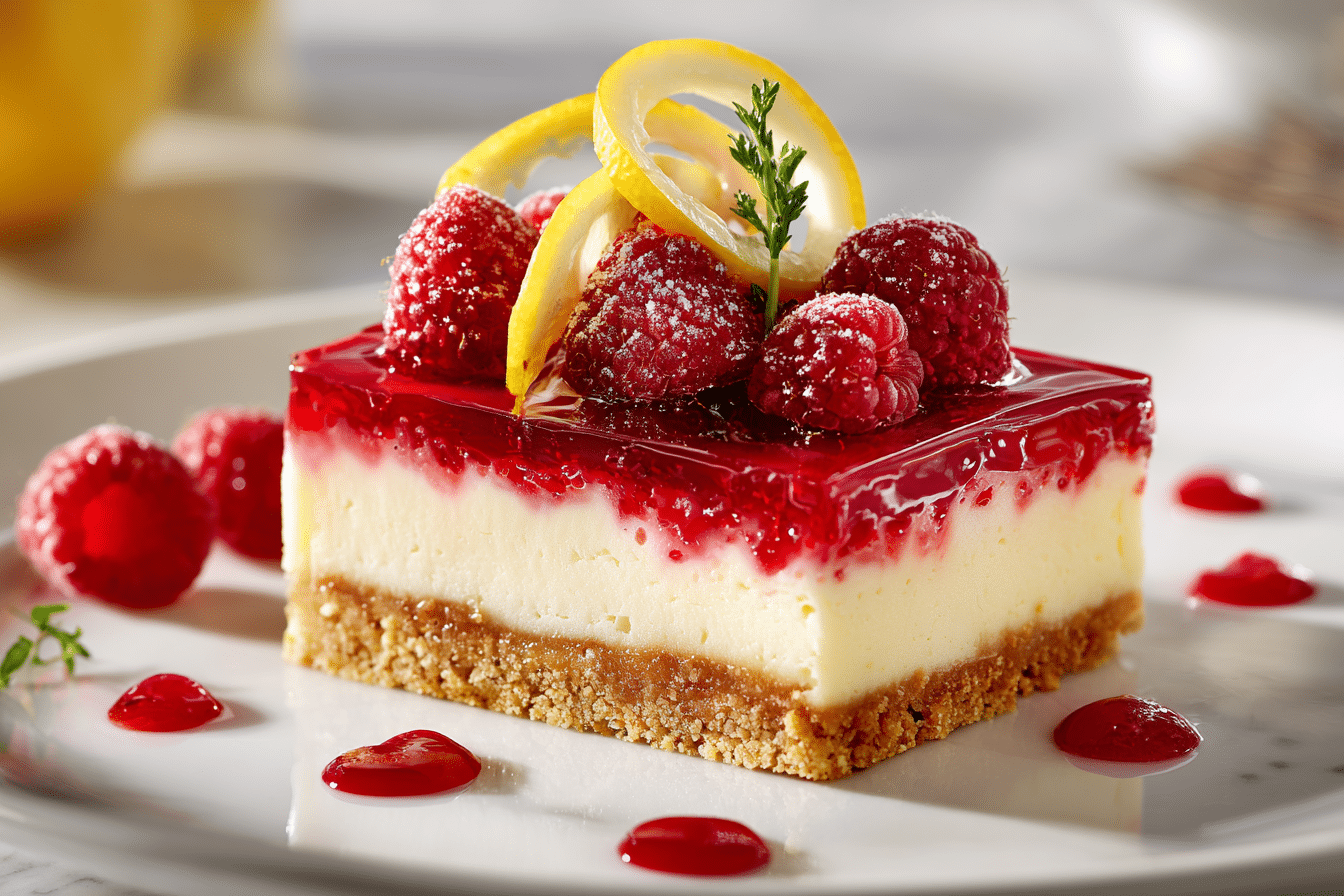 No-Bake Version: Use gelatin to set a cream cheese–lemon mixture and chill in a cookie crust. Add raspberry topping before serving.