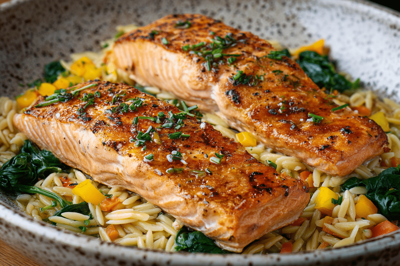Crispy pan-seared salmon fillets served over tender lemon-garlic orzo cooked with herbs and broth — a light, one-pan meal packed with flavor.