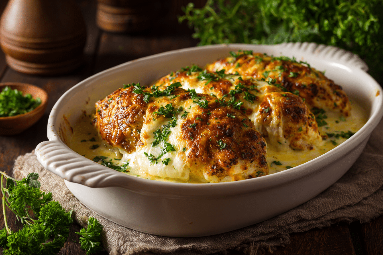 Bake uncovered for 30–35 minutes, or until the chicken reaches an internal temperature of 165°F (74°C) and the cheese is bubbly and golden. -
