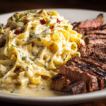 Rooted in the hearty satisfaction of Southern and American steakhouse cooking, this dish blends the rustic charm of cast iron-seared steak with a pasta sauce that’s creamy, cheesy, and just indulgent enough. The rotini holds the sauce in every spiral, creating a flavorful bite every time. Perfect for cozy evenings, special dinners, or just when you’re craving something rich and satisfying, this dish brings steakhouse flair straight to your kitchen.