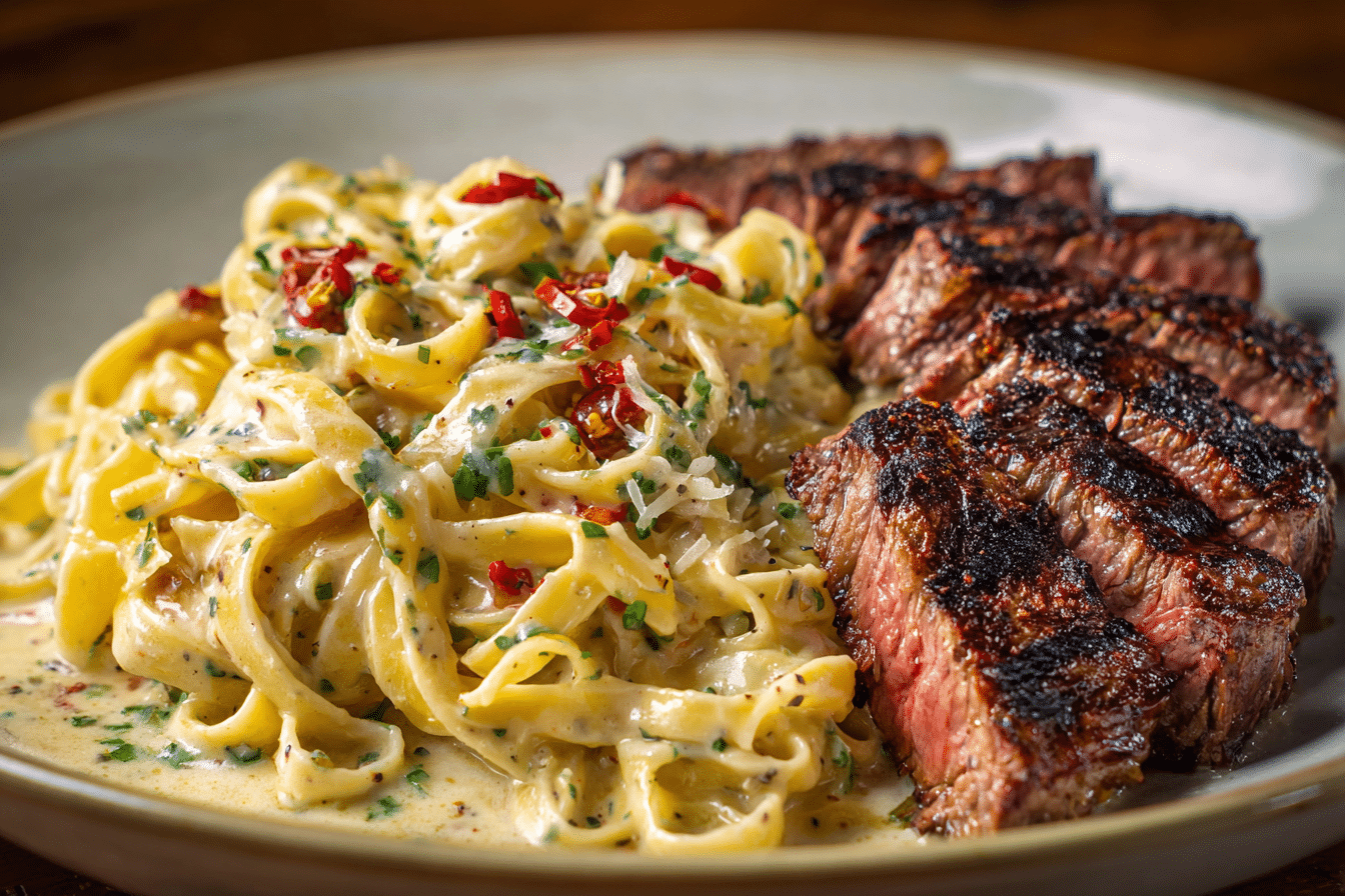 A6: The cheddar cream sauce may separate slightly when thawed, but it’s still usable. Reheat gently while stirring. Freeze the steak and pasta separately in airtight containers for up to 2 months.