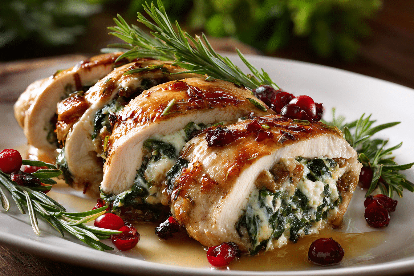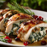Tender, juicy chicken breasts filled with a creamy spinach and cranberry stuffing, seared and baked to golden perfection. A festive and easy main dish.