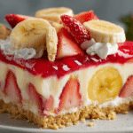 Strawberry Banana Pudding Dream is a showstopping no-bake dessert that layers fresh strawberries, sliced bananas, creamy vanilla pudding, and fluffy whipped topping over a bed of vanilla wafers or cake. It’s dreamy, indulgent, and effortless — the kind of chilled dessert that disappears fast at potlucks, cookouts, and family dinners.