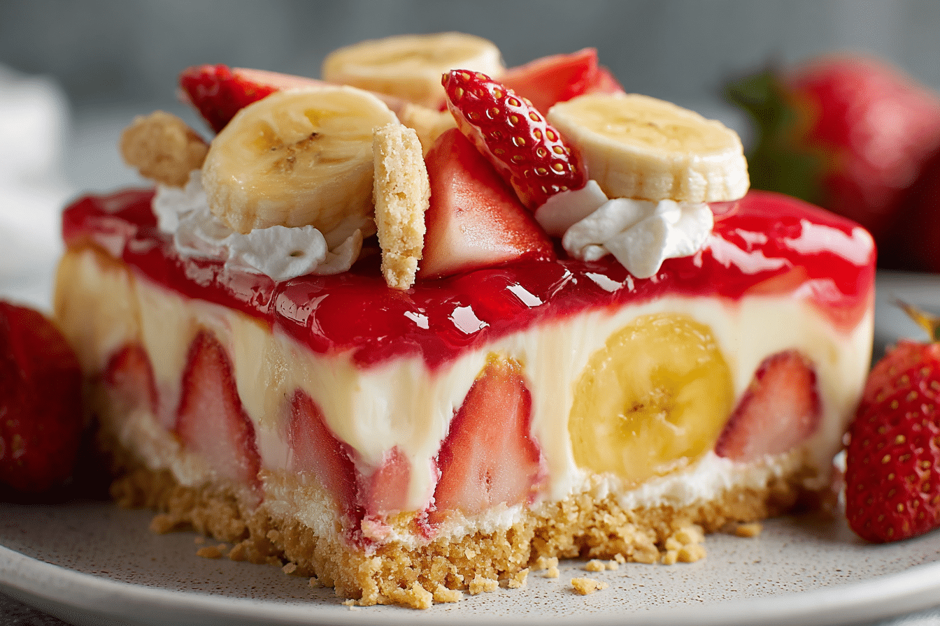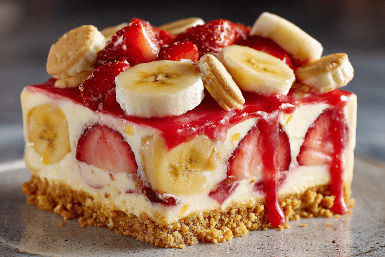 A cool, creamy no-bake dessert layered with vanilla pudding, fresh strawberries, bananas, whipped topping, and vanilla wafers — perfect for potlucks and summer gatherings.