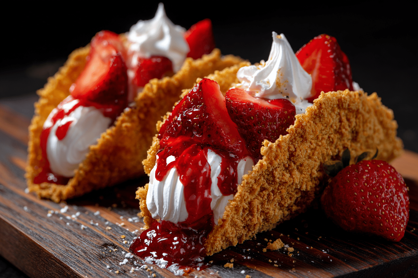 Crispy cinnamon-sugar taco shells filled with rich cheesecake mousse and juicy strawberries. A sweet, crowd-pleasing handheld dessert.