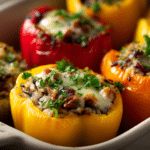 This dish has roots in Mediterranean and Eastern European cuisines, where bell peppers have long been used as natural edible vessels for flavorful stuffings. The vegetarian version, especially, highlights the beauty of whole-food ingredients—warm, tender peppers filled with fluffy rice, aromatic herbs, and savory veggies.