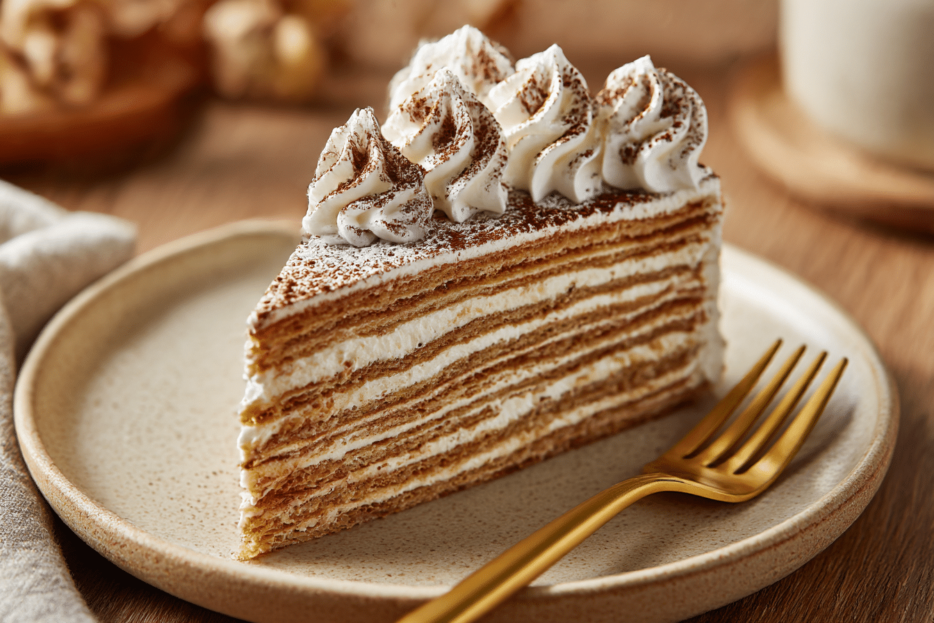 A no-bake layered crêpe cake filled with whipped vanilla cream and spiced Speculoos spread. Soft, elegant, and perfect for celebrations.